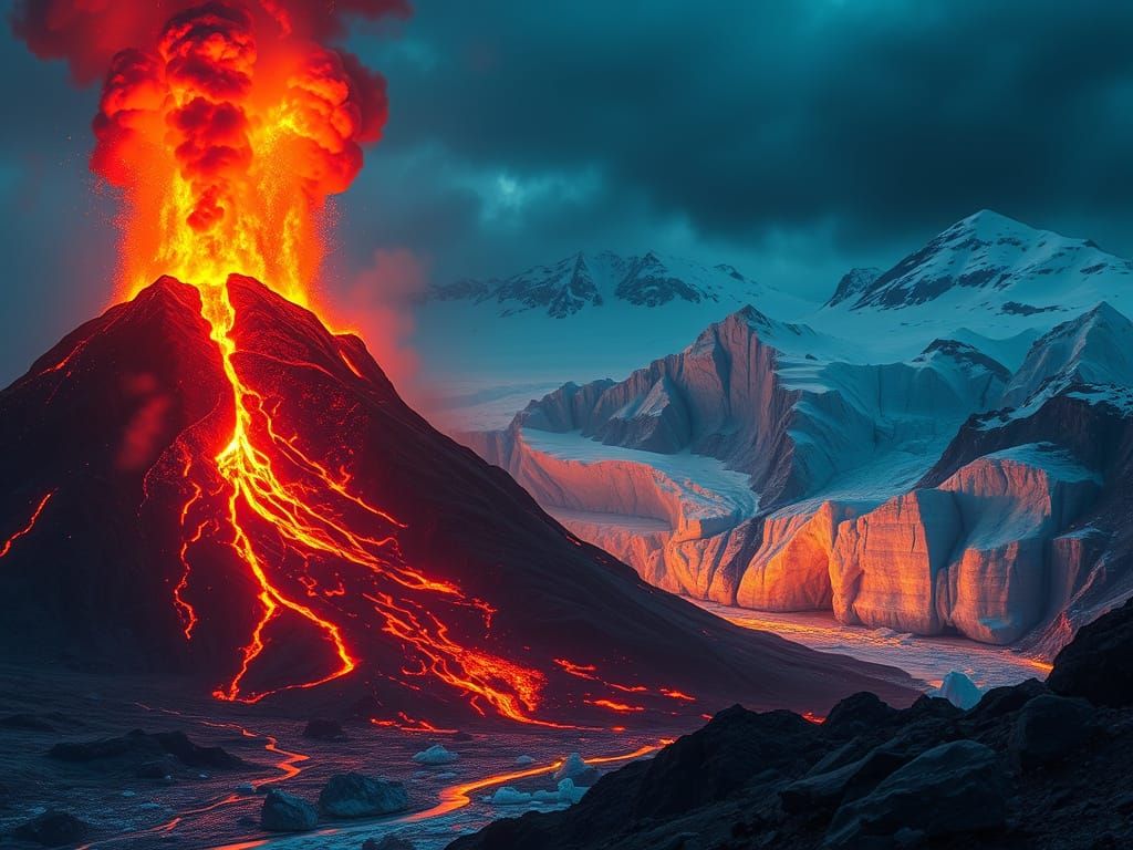 This hyperrealistic image captures a dramatic clash between a fiery volcano spewing lava and a calm, icy glacier with crystalline formations, bathed in cinematic light.