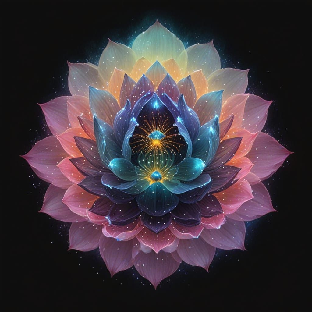 This image shows a surreal lotus flower with cosmic and astral elements, evoking a sense of tantric beauty. The artwork features galactic nebulae and a supernova explosion.