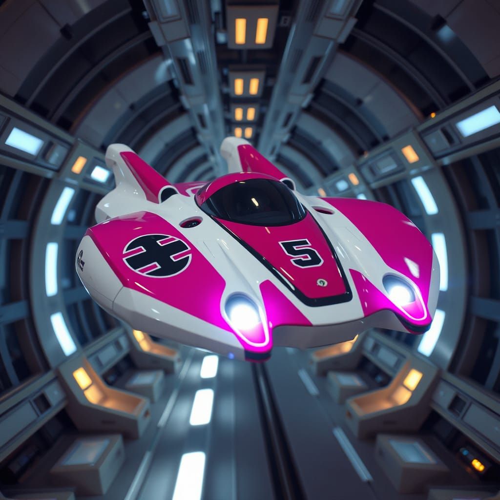 3D angled aerial photo of a far future flying floating soaring cyber tech sport hover-speeder with aerodynamicly designed plastic multicolour sections in pink maroon and white with forward nacelles and sporty future logos with chunky lettering with rounded edges. flying through a complex network of tunnels. ...