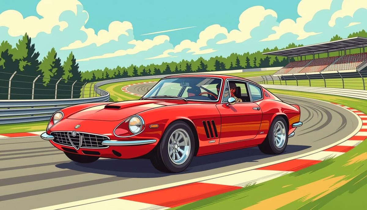 This image shows a wine-red sports car speeding along a racetrack. The illustration combines retro automotive designs in a hand-drawn color comic art style.