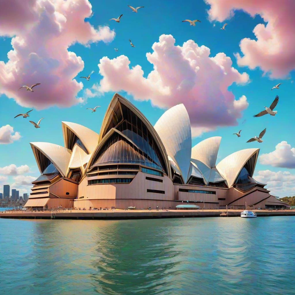 This image shows a fantastical Sydney Opera House surrounded by fluffy clouds and birds in flight, set against a picturesque harbor scene with sharp reflections on the water.