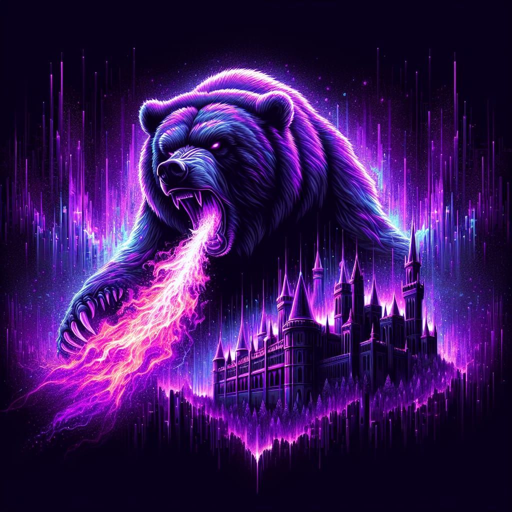 This image shows a majestic violet Kodiak bear unleashing bright purple flame towards a grand castle. The scene is set in stark, cyber-inspired darkness with neon glows.