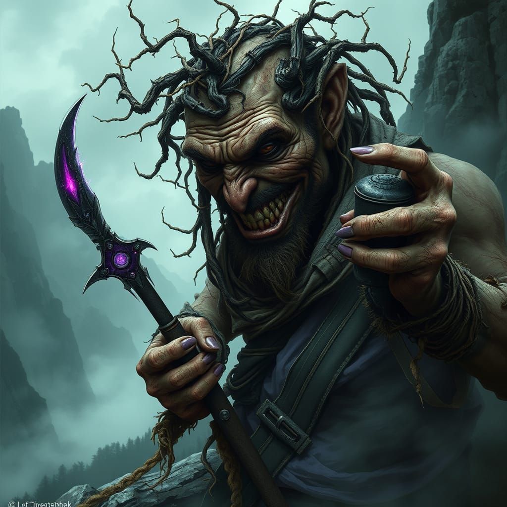 A close-up of a rugged, weathered face and hands, with an unnerving grin, amidst twisted, mechanical blades with a subtle purple glow, set in a mist-shrouded mountain landscape with an eerie, atmospheric lighting.