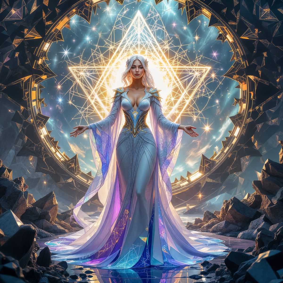 A striking picture of an ethereal woman amidst an infinite fractal dreamscape. This image features crystalline structures, tessellated terrains, and glowing Platonic solids, rendered in a hyperrealistic digital style.
