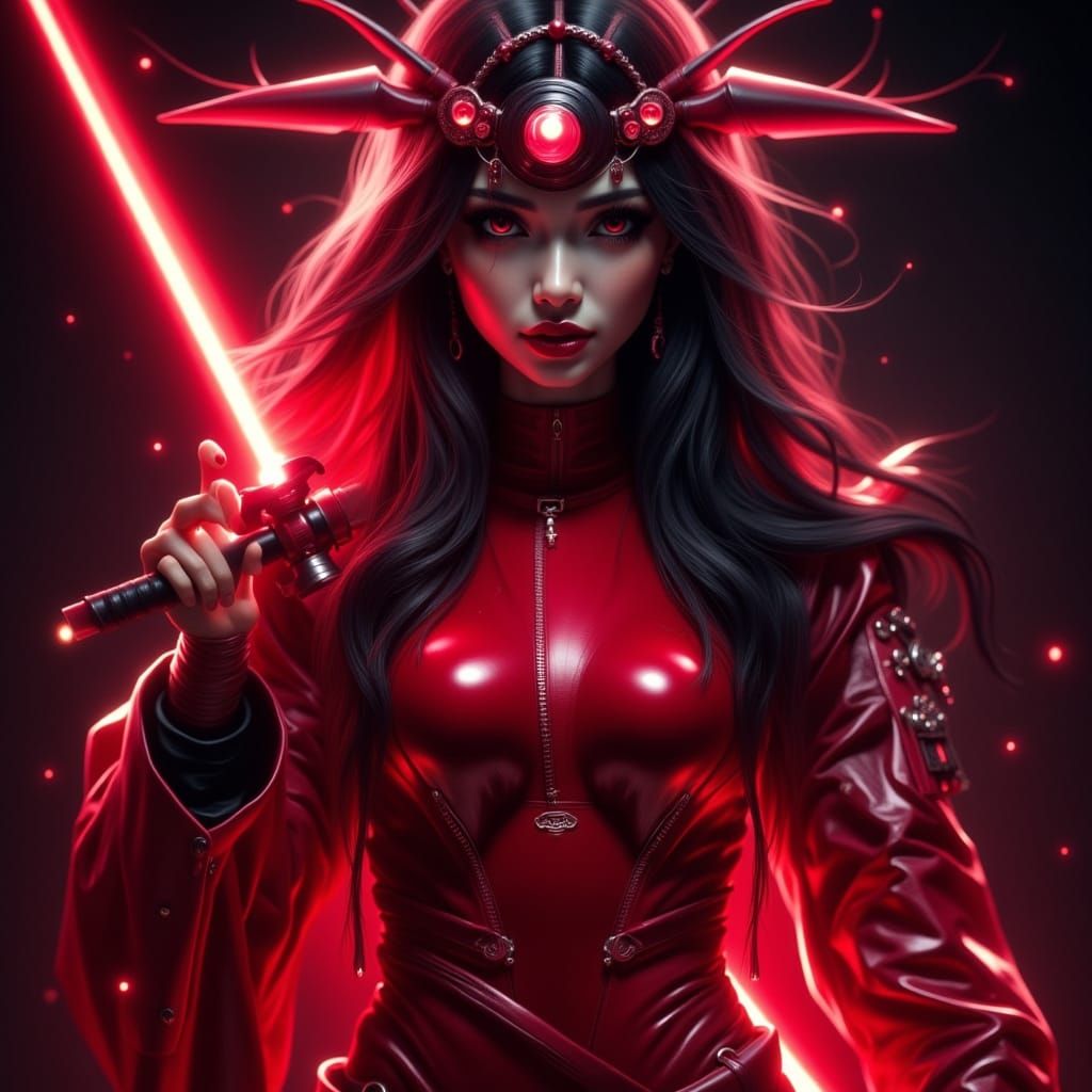 A striking picture of a slender Japanese assassin in a red leather suit and headdress. The image features sleek lines, neon accents, and vibrant character design against a dark background in a hyperreal style.