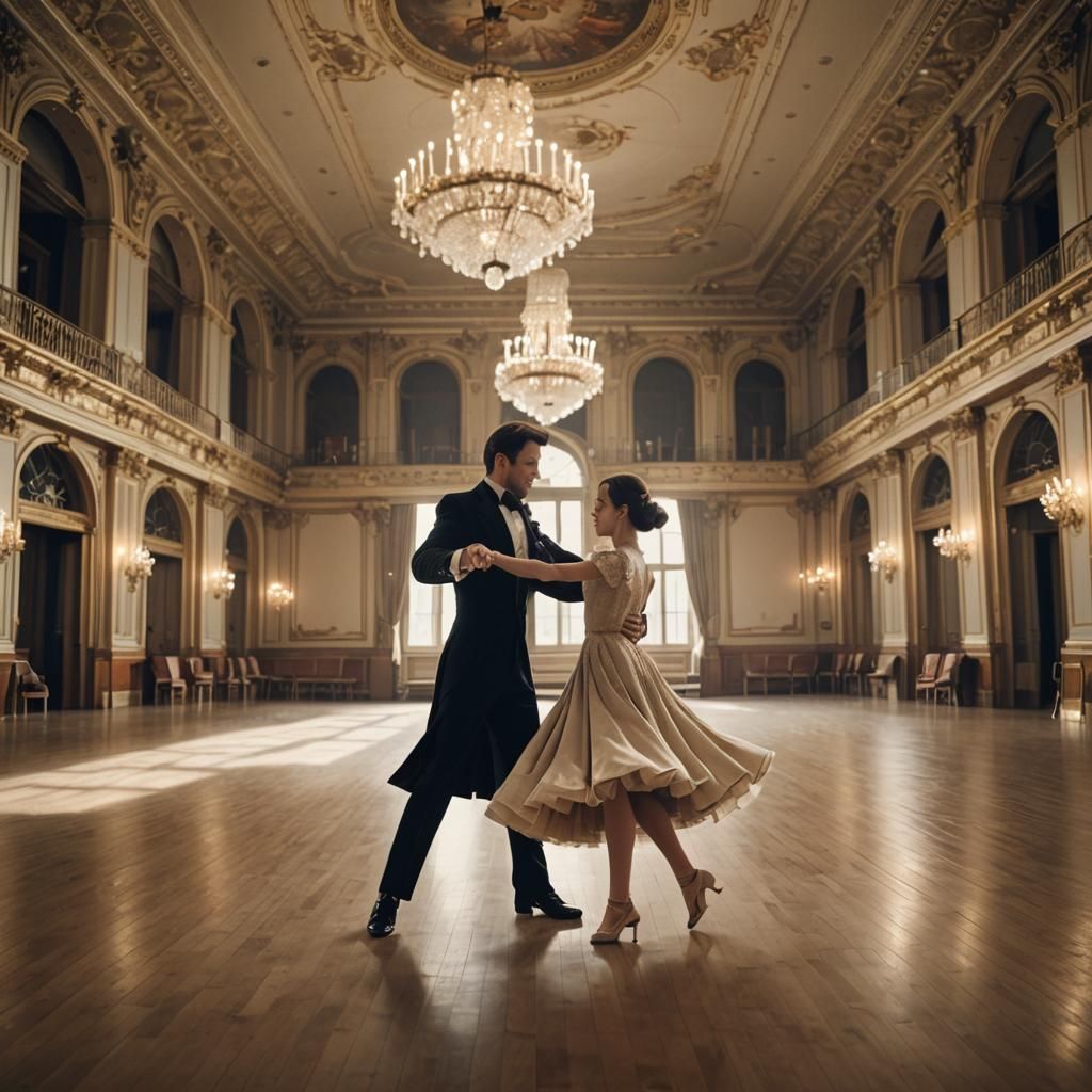 This image depicts a man and woman ballroom dancing in an empty ballroom. The couple is posed gracefully, highlighting the elegance and precision of the dance.