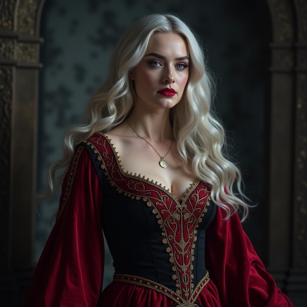 A digital painting of a Blackfyre princess with silver hair, purple eyes and red lips, wearing a red and black medieval gown. The image blends gothic romanticism with rich textures and mystical grandeur.