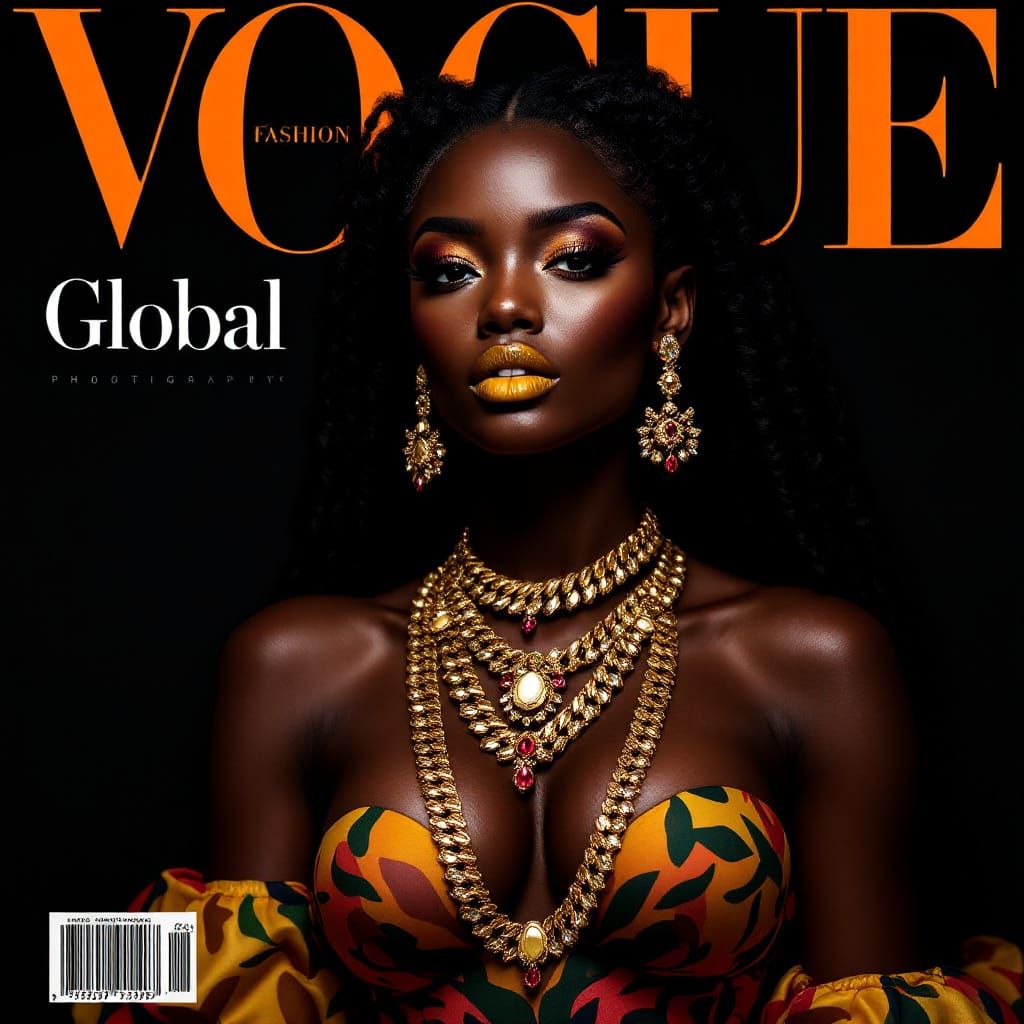 This image shows a stunning, muscular Black woman on a "Global Vogue" magazine cover. She wears a vibrant, multicolor dress, bold makeup, and opulent gold jewelry, illuminated by dramatic backlighting for a fine-art photography effect.