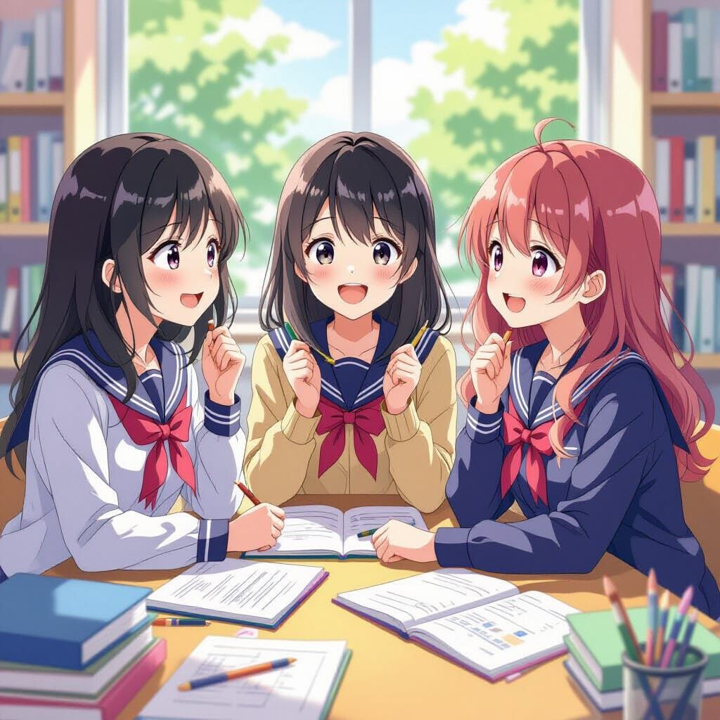 This image shows anime school girls enjoying a lighthearted moment. The artwork features a vibrant, pastel color palette and evokes the style of popular anime artists.