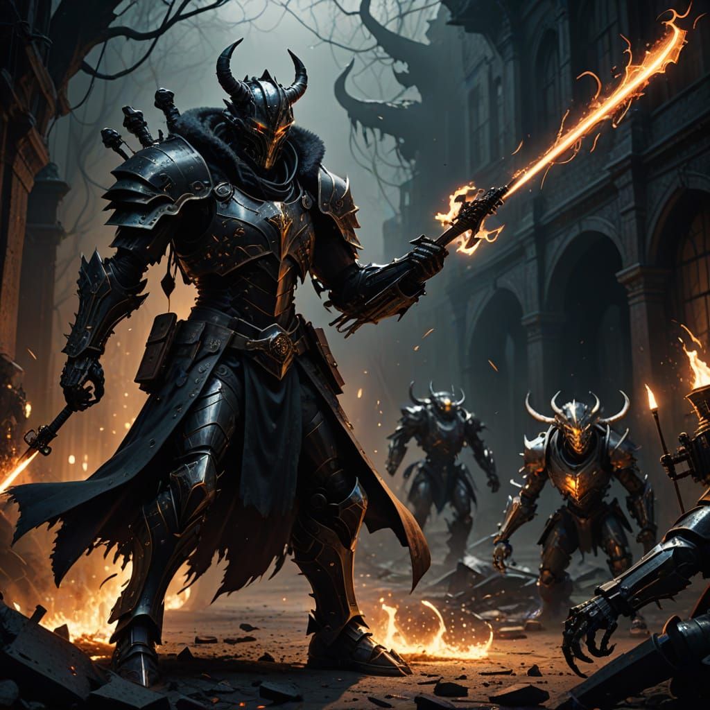 This image shows a dark fantasy warrior in detailed armor playing a violin, with shadowy hands and scattering ash particles. Features cinematic lighting and vibrant fire contrast.