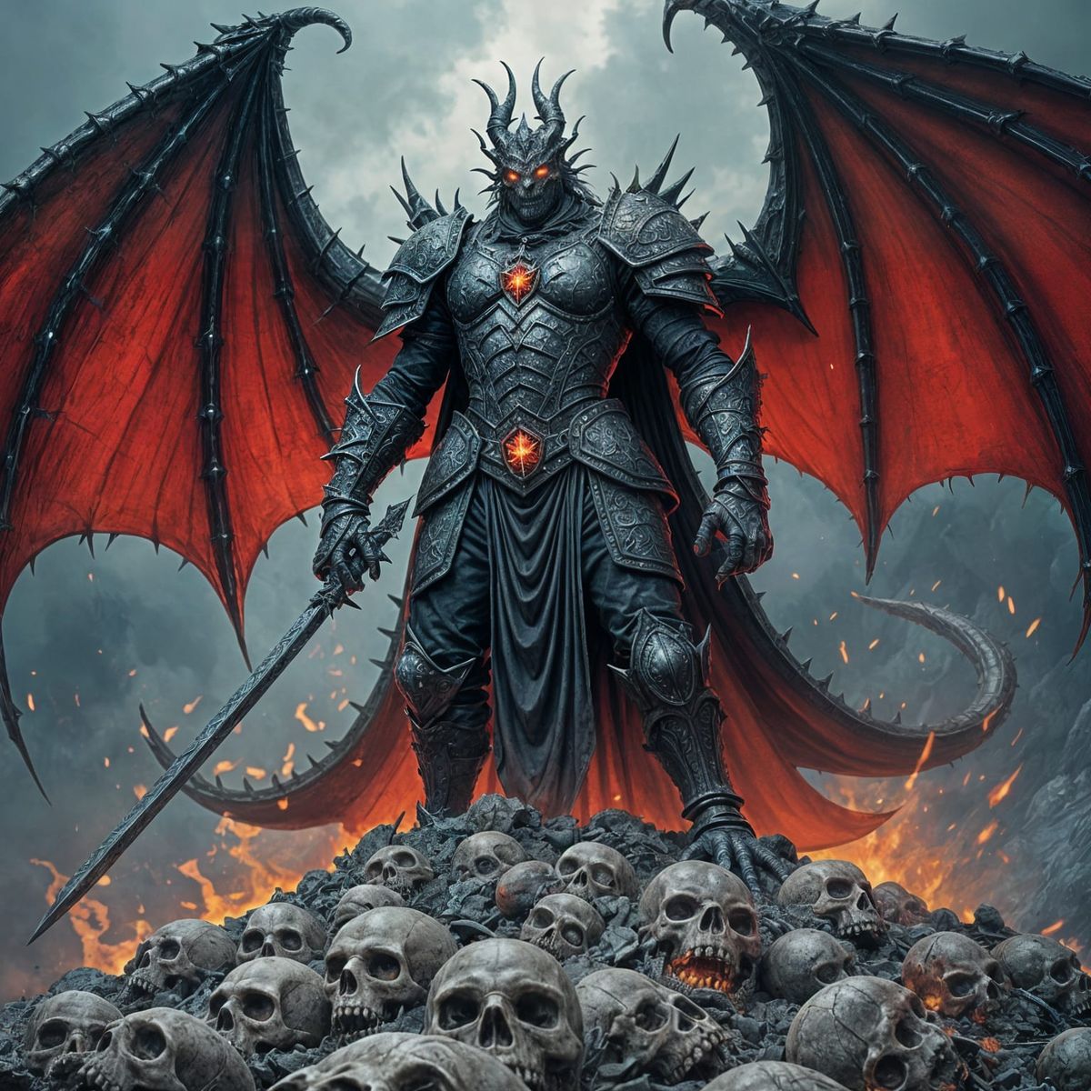 This image shows a fearsome dragon-warrior king in blackened armor adorned with glowing runes, standing atop a pile of skulls. The illustration is in a dark, intricately detailed manga style.