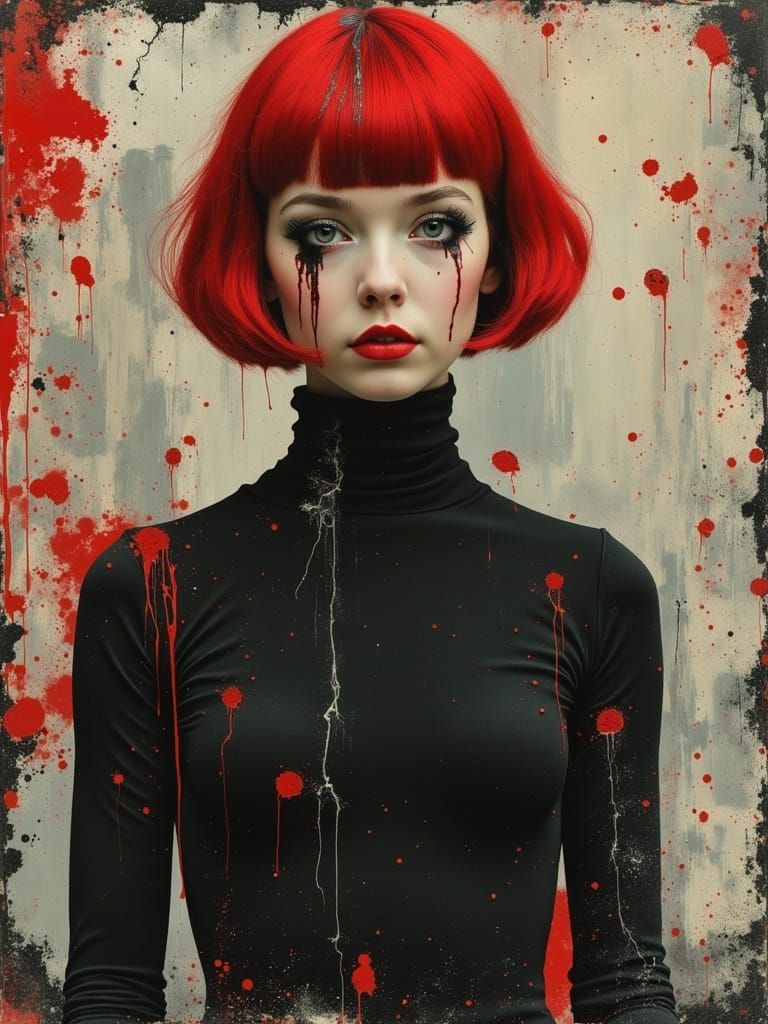 A digital painting of a gothic woman with short red hair. The artwork features grunge textures, brushstroke details and moody lighting, creating a dystopian atmosphere in a lowbrow, pop surrealism style.