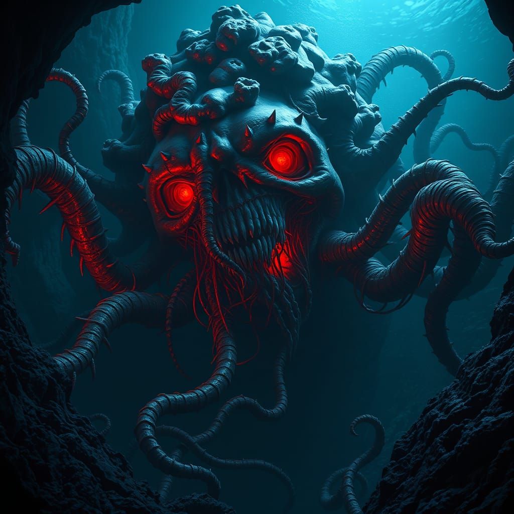 A colossal, eldritch entity with coral-like growths and bone structures lurks in a deep, forgotten ocean trench, pulsing with dark, blood-red hues and glowing eye sockets.