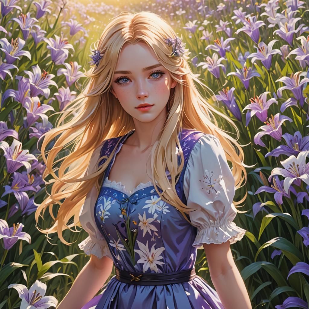 This image shows a blonde girl with purple eyes in a lily meadow. She wears a blue dress, bathed in golden sunlight. The vivid colors and anime style create a serene, hyper-realistic digital artwork.