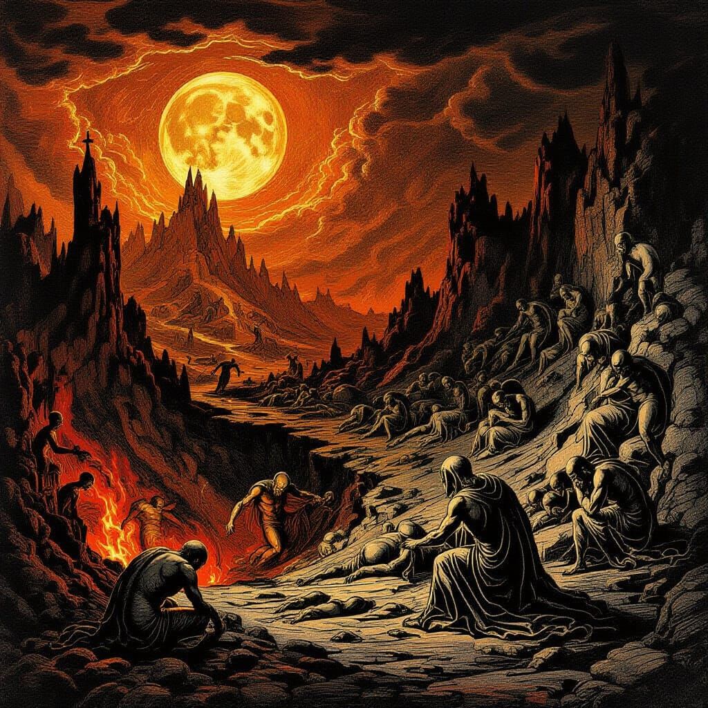 Generate your own images of Dante's Divine Comedy, inspired by Gustave Doré's wood-engravings. Free and easy to use!