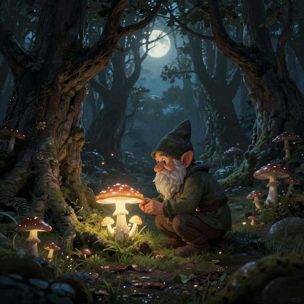 This image shows a gnome in a hidden glade, tending a garden of glowing mushrooms under moonlight. Rendered in a detailed concept art style with dramatic lighting.