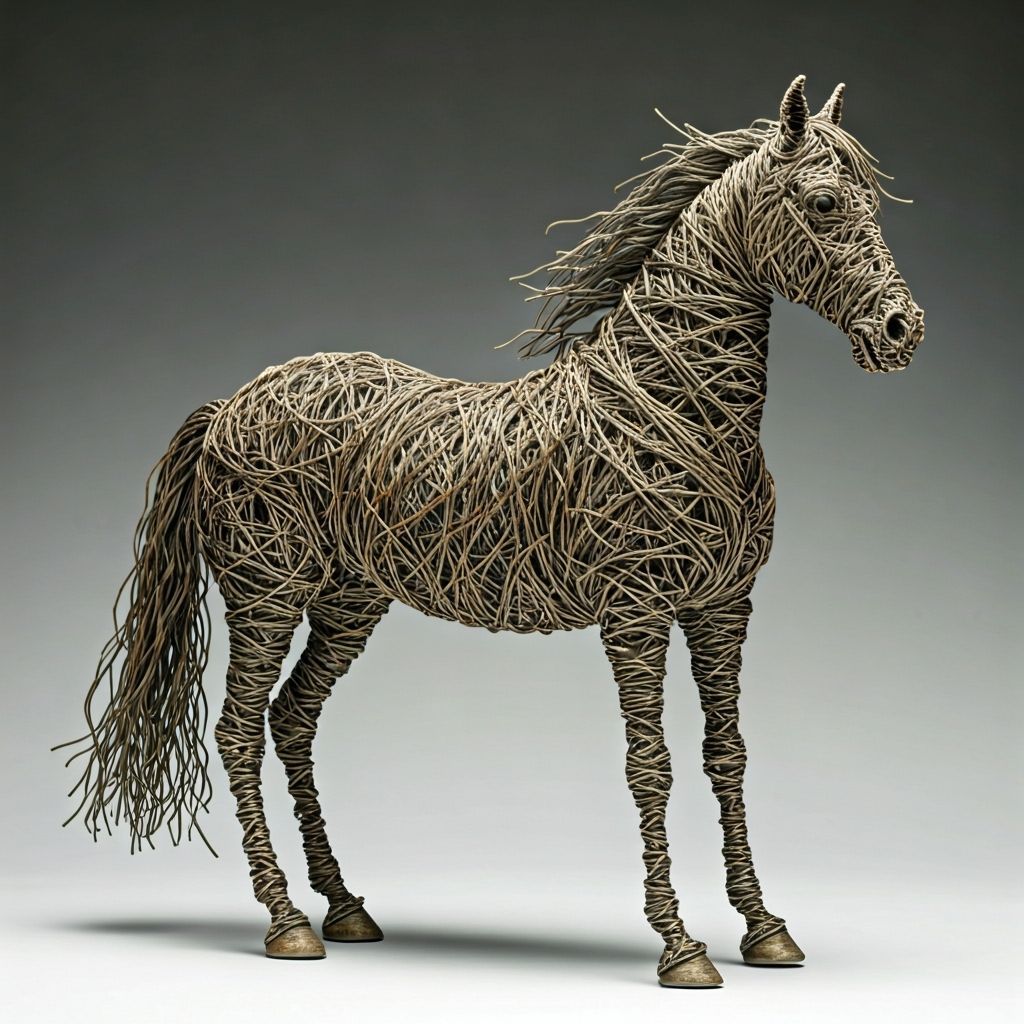 This image shows an intricate wire sculpture of a horse. The artwork features twisted metal threads and earthy tones, creating a poetic and expressive feel with organic textures.