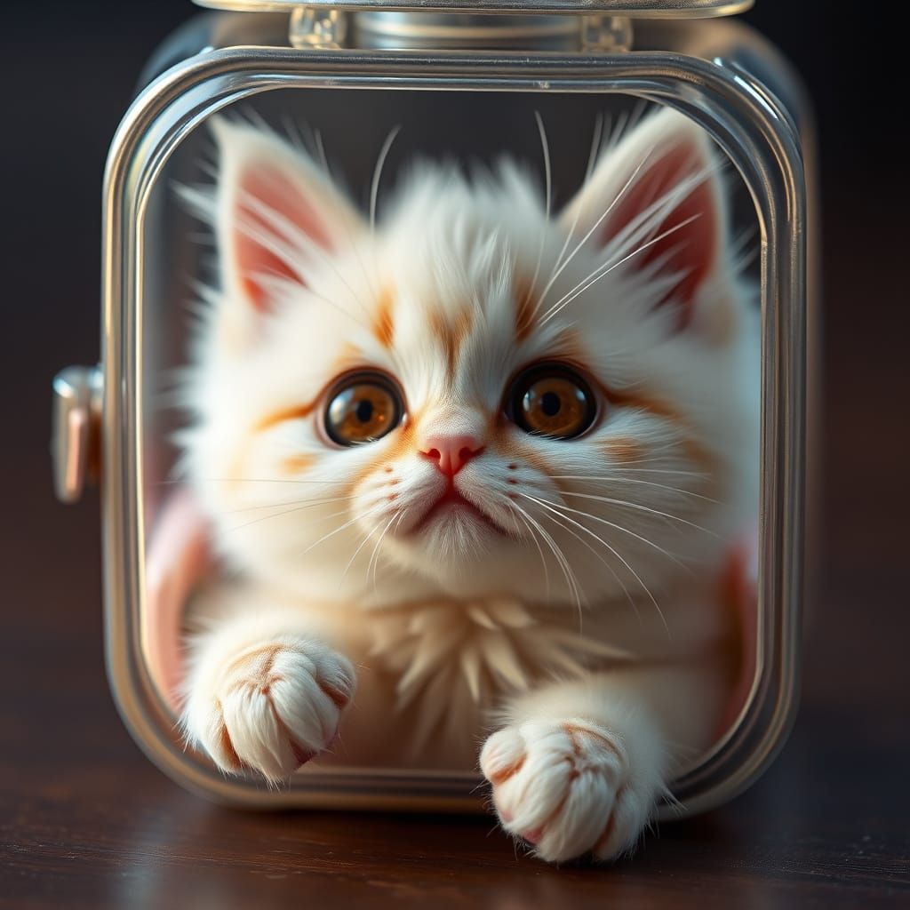 A tiny, snuggly kitty with lush white fur and big, shiny brown eyes gazes up from a delicate, intricately detailed mini container, reminiscent of high-contrast textures and realistic, atmospheric lighting.