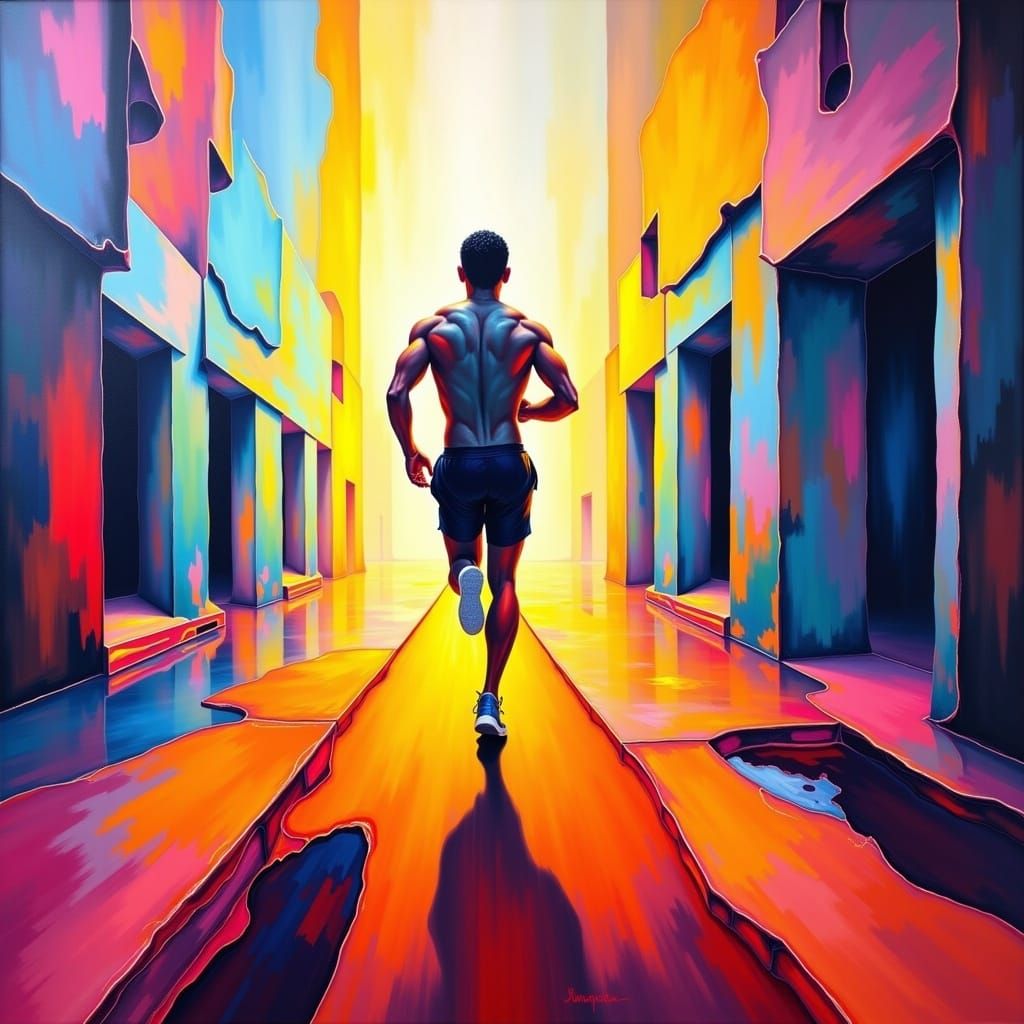 This image shows a runner crossing the finish line. The artwork is a vibrant, liminal abstract painting, capturing the energy and emotion of the moment.