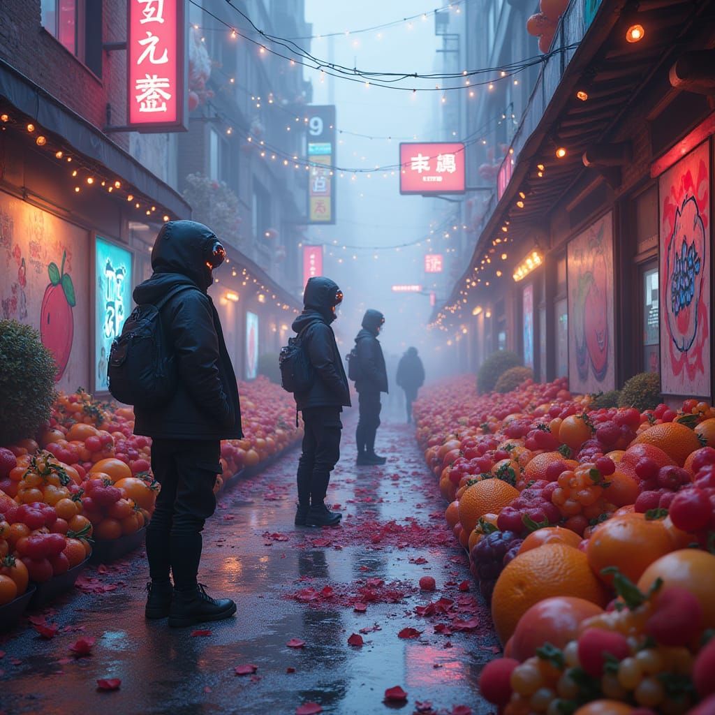This AI-generated image depicts a misty, neon-lit city adorned with vibrant fruit. Young adults in futuristic attire create street art using food dye in a style inspired by classic sci-fi aesthetics.