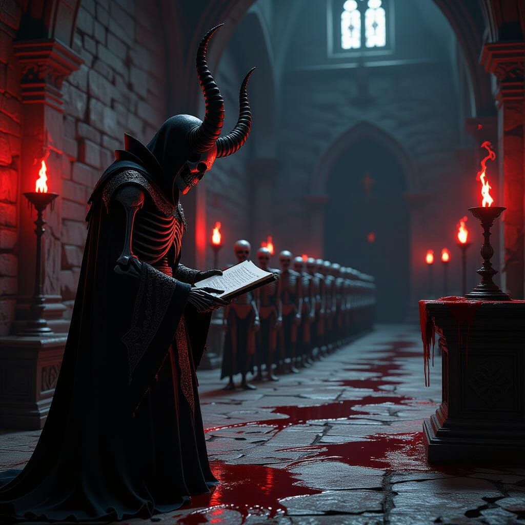 This image shows a skeletal devil by an altar, recording names of the dead. Skeletal figures wait in line by red torches. Rendered with epic 3D videogame graphics, this detailed scene has dynamic lighting.