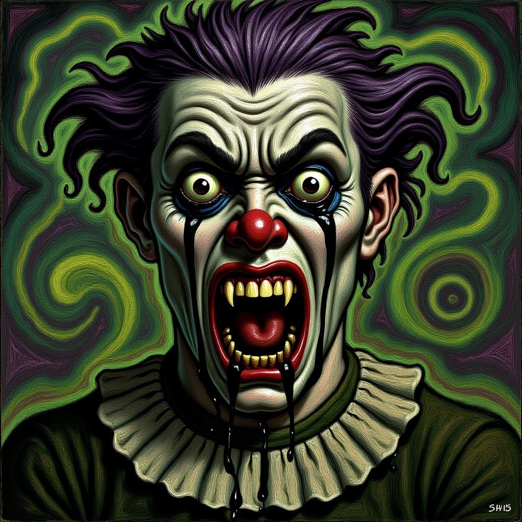 A close-up image reveals a jester's face contorted in anguish, with dark tears. The chaotic background features sickly greens and purples in a surrealist style. Impasto brushstrokes and dynamic lighting add to the sinister aesthetic.