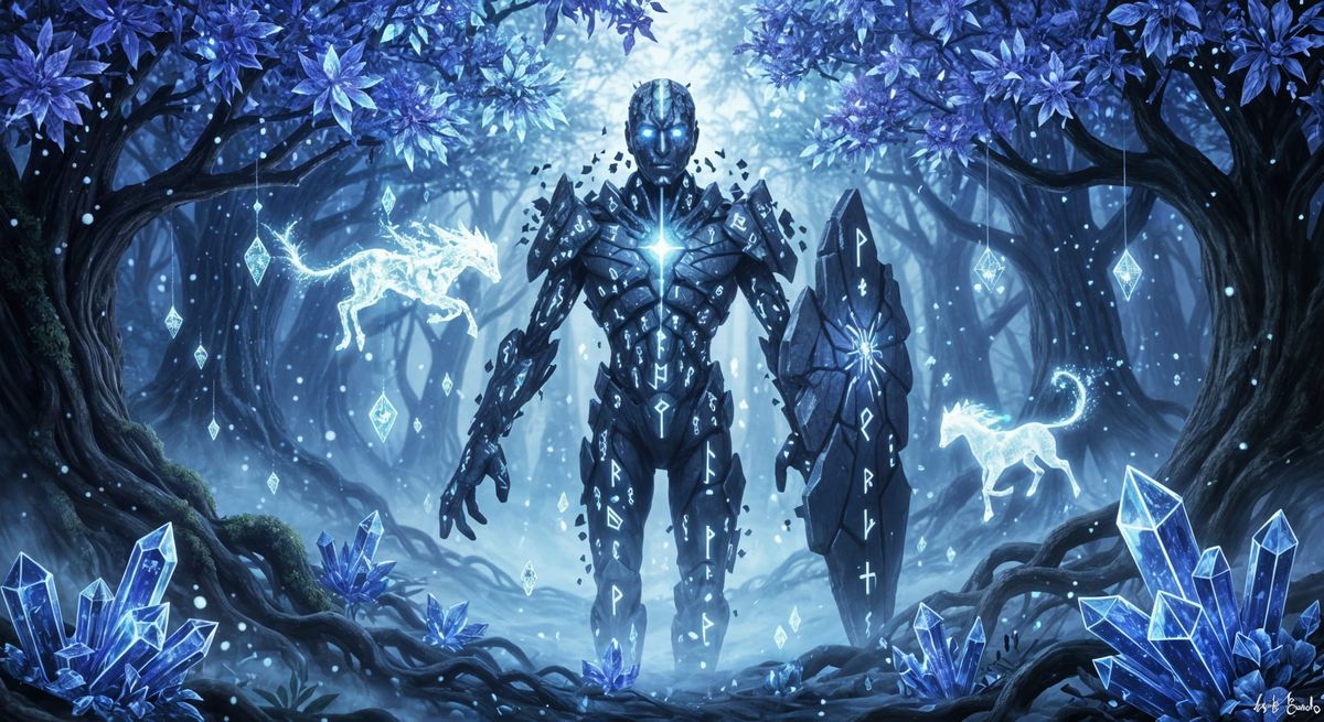 This image depicts a mystical enchanted forest with a towering stone guardian. Trees of shimmering crystal and luminous leaves are bathed in moonlight, creating a magical, atmospheric scene with spirit animals.