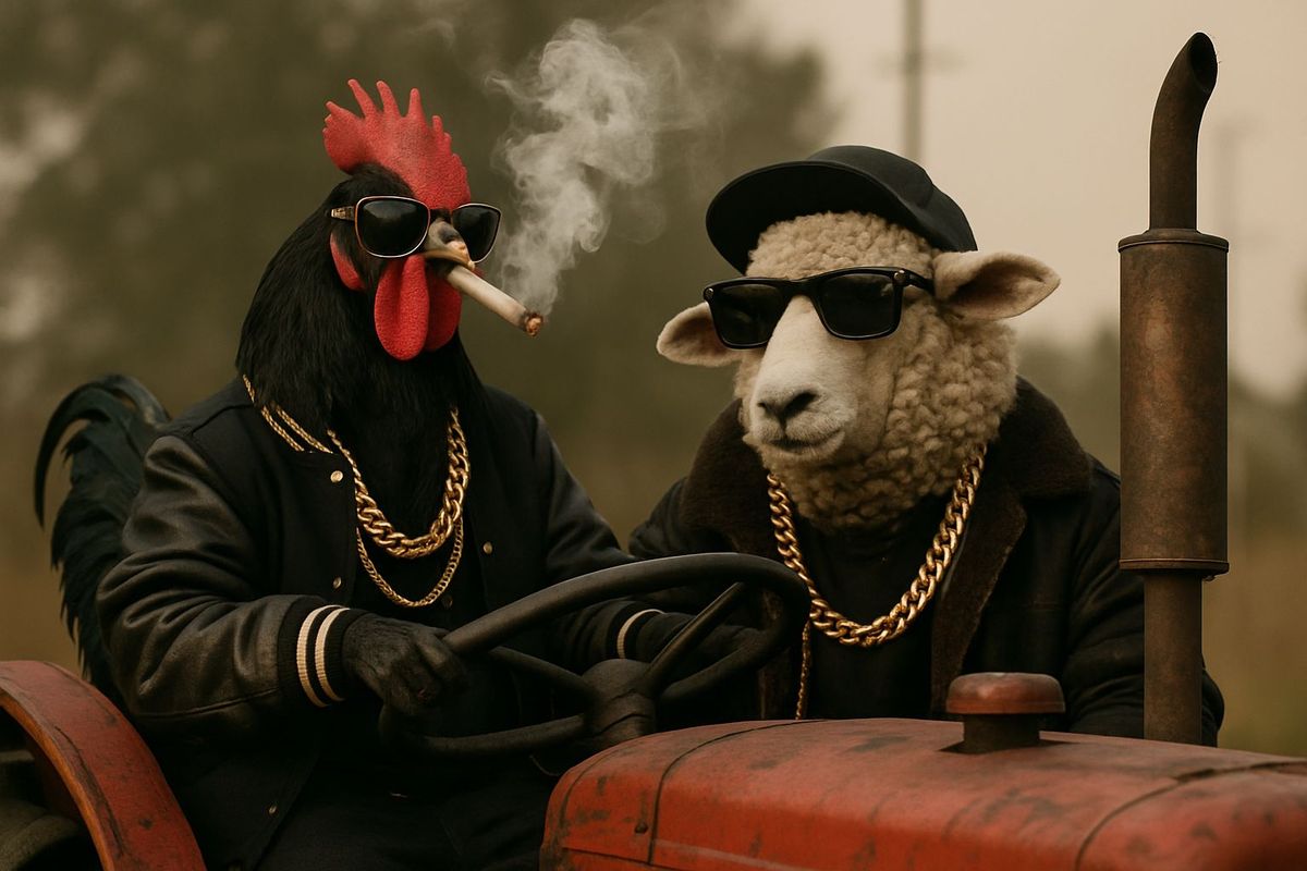 This image is a photorealistic depiction of a stylish chicken and goat duo cruising a tractor, enjoying a cigar, in a hip-hop inspired aesthetic reminiscent of 90s rap culture.