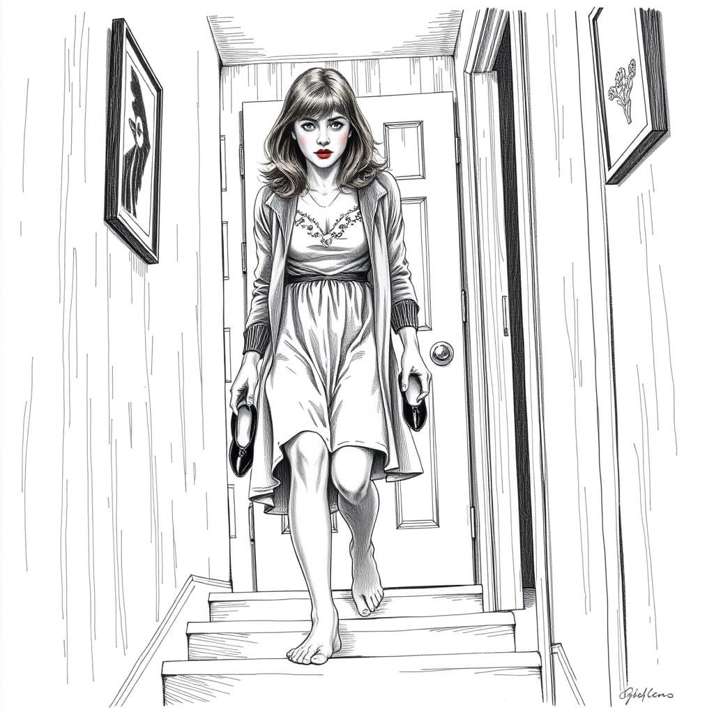 A black and white engraving of a young woman returning to her bedroom. The artwork features intricate textures and dramatic shading in the style of classic engravers.