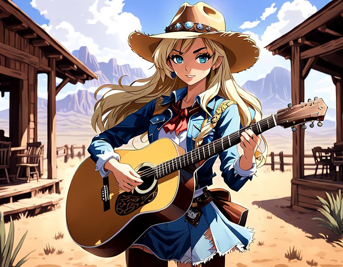 A digital anime illustration of a cowgirl playing a dreadnought acoustic guitar. The artwork depicts a Western scene with the subject looking directly at the viewer.