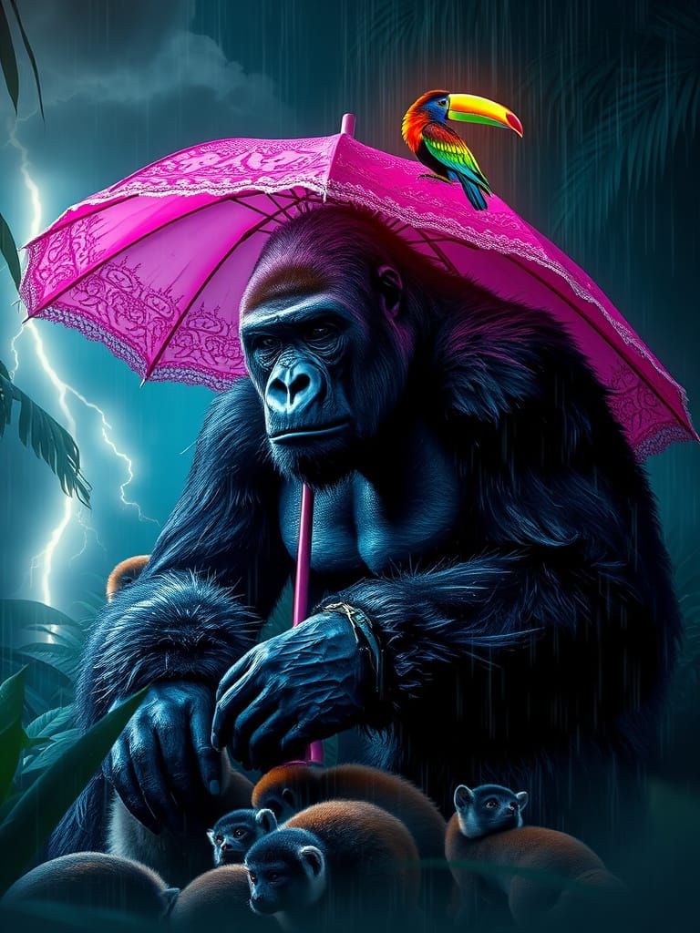 This hyper-realistic image shows a detailed, glowing black gorilla in a dense jungle holding a vintage parasol. Lemurs and a neon toucan are present in the misty, rain-soaked scene illuminated by lightning.