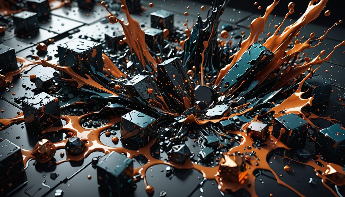 This image shows a macro photograph of abstract, organic, sci-fi material. It features a three-dimensional interface with fluid shapes and dynamic gravity, rendered as a detailed matte painting with deep, complementary colors.