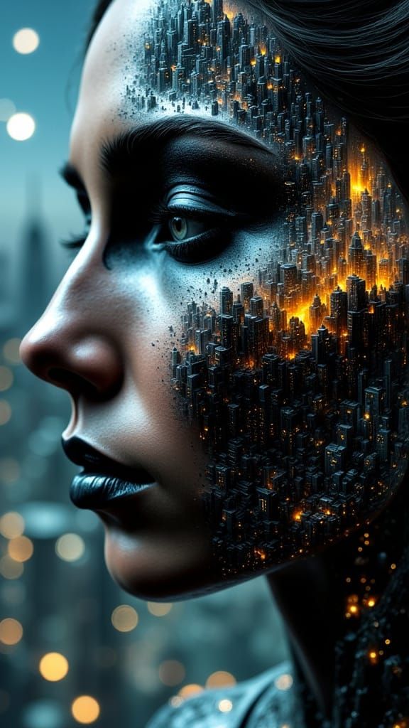 This image shows a symmetrical portrait of a woman. One side of her face features metallic black makeup, reflecting a futuristic cityscape in an abstract reality.