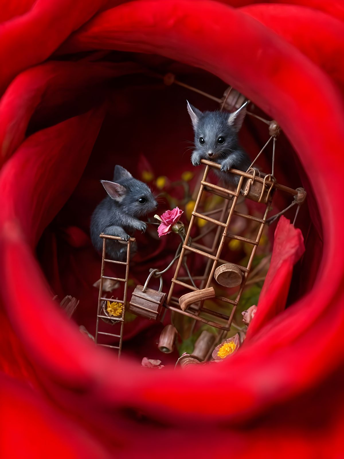 This image shows tiny, furry creatures collecting pollen inside a giant crimson rose. They've built scaffolding and use pulleys to gather pollen, set against a bokeh background with sharp details and contrasting colors.