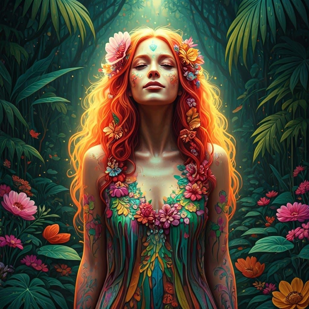 This image shows a vibrant woman in a flowing, colorful outfit surrounded by nature. The artwork features psychedelic elements and a dreamlike environment with a holographic, moody atmosphere, rendered with oil and gouache effects.