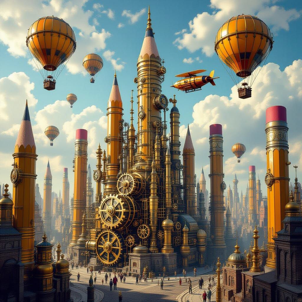 A steampunk cityscape constructed entirely from colossal pencils, gears, and clockwork mechanisms. Brass and copper pipes intertwine with graphite shafts, and the sky is filled with hot air balloons shaped like erasers. A miniature dirigible resembling a pencil sharpener navigates between the towering ...