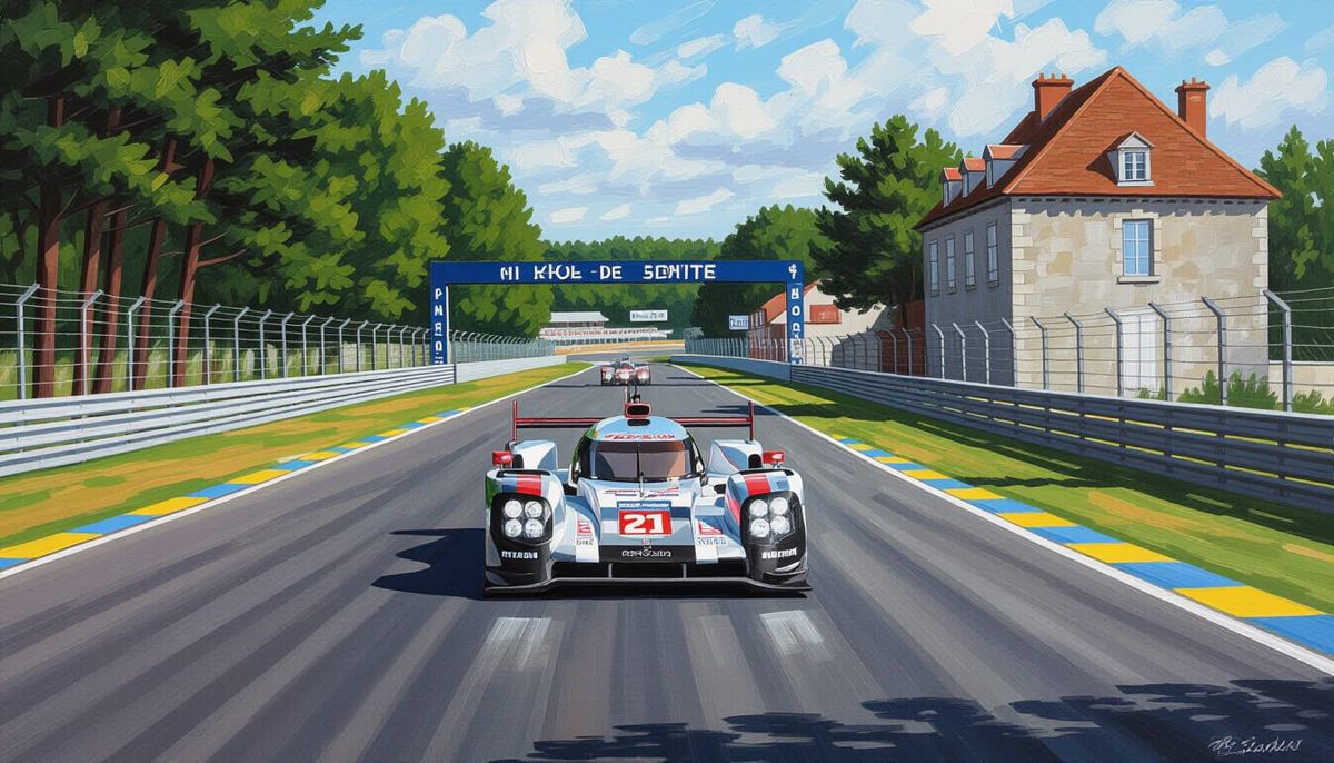This image captures a 2017 Porsche 919 LMP1 race car in a silver Martini Racing livery on the Mulsanne Straight. The painting style features rich textures and thick layers of paint, evoking neo-impressionist and expressionist influences.