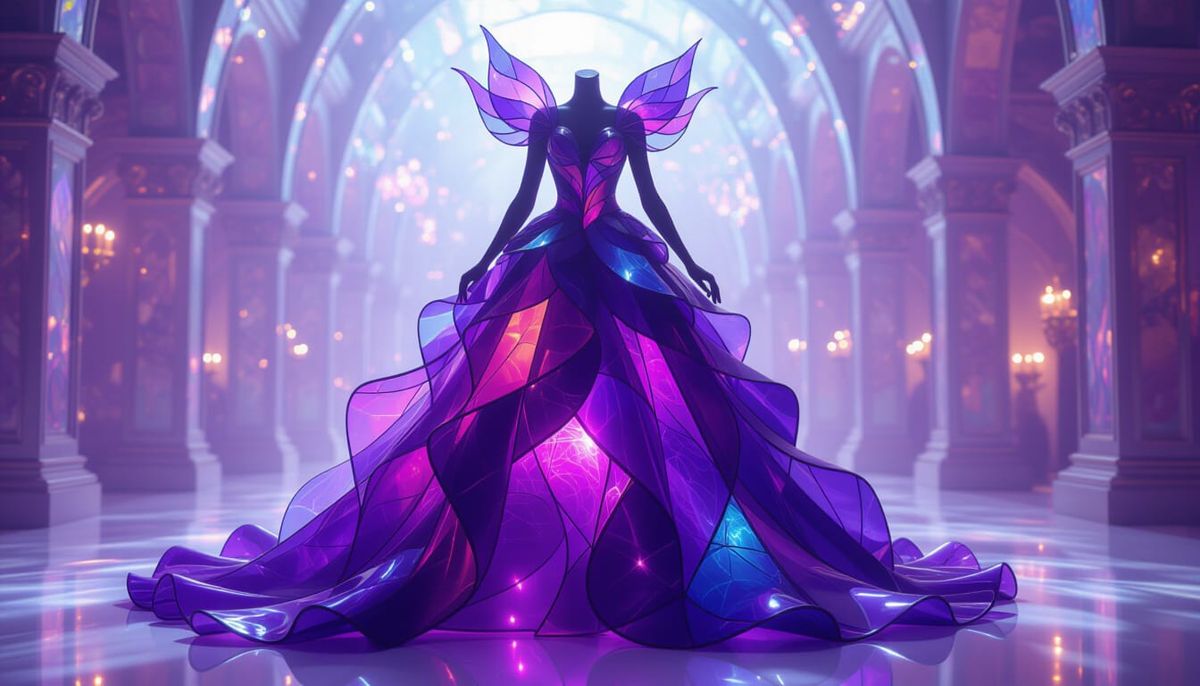 This image showcases a fantastical purple dress made of shimmering, translucent enchanted glass. It features vibrant stained glass patterns pulsing with magical light, creating a dreamlike, crystalline effect in an avant-garde style.