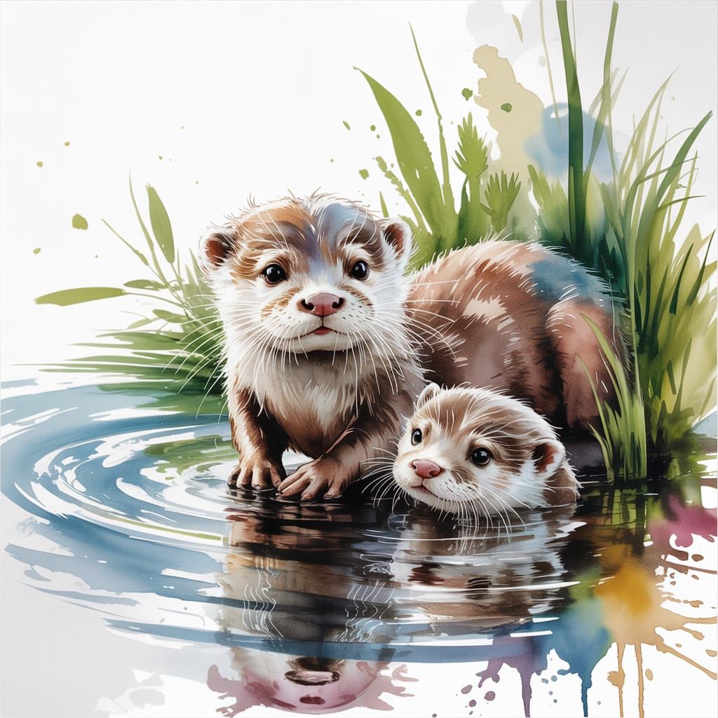 This image shows adorable otter babies playing on a river bank, rendered in a whimsical watercolour style with expressive brushstrokes and a harmonious blend of artistic influences.