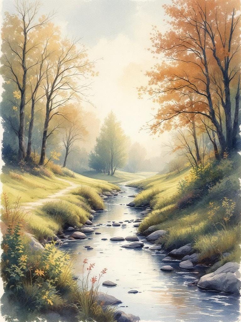 A serene watercolor painting of a cottagecore scene featuring a gentle stream. The artwork evokes a sense of rustic charm and tranquility with soft, flowing colors.