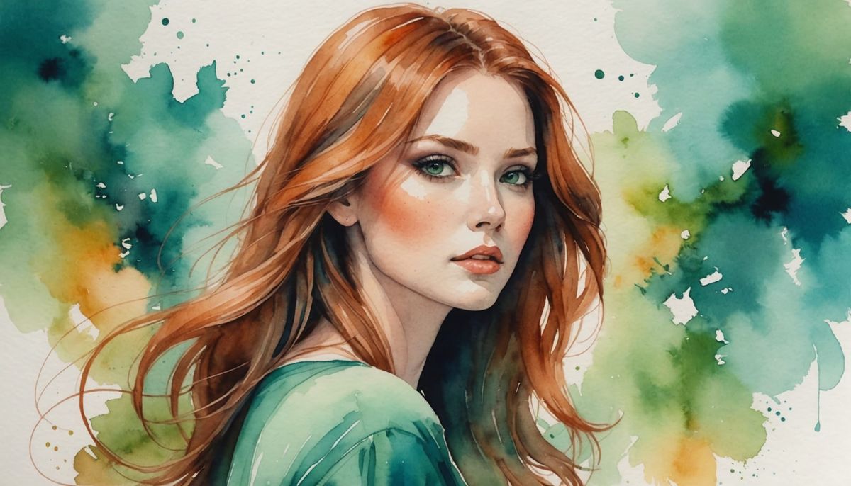 A digital image of a beautiful woman in a full view pose. The artwork exhibits shades of orange and teal, and is reminiscent of a Japanese ink and watercolor wash sketch.