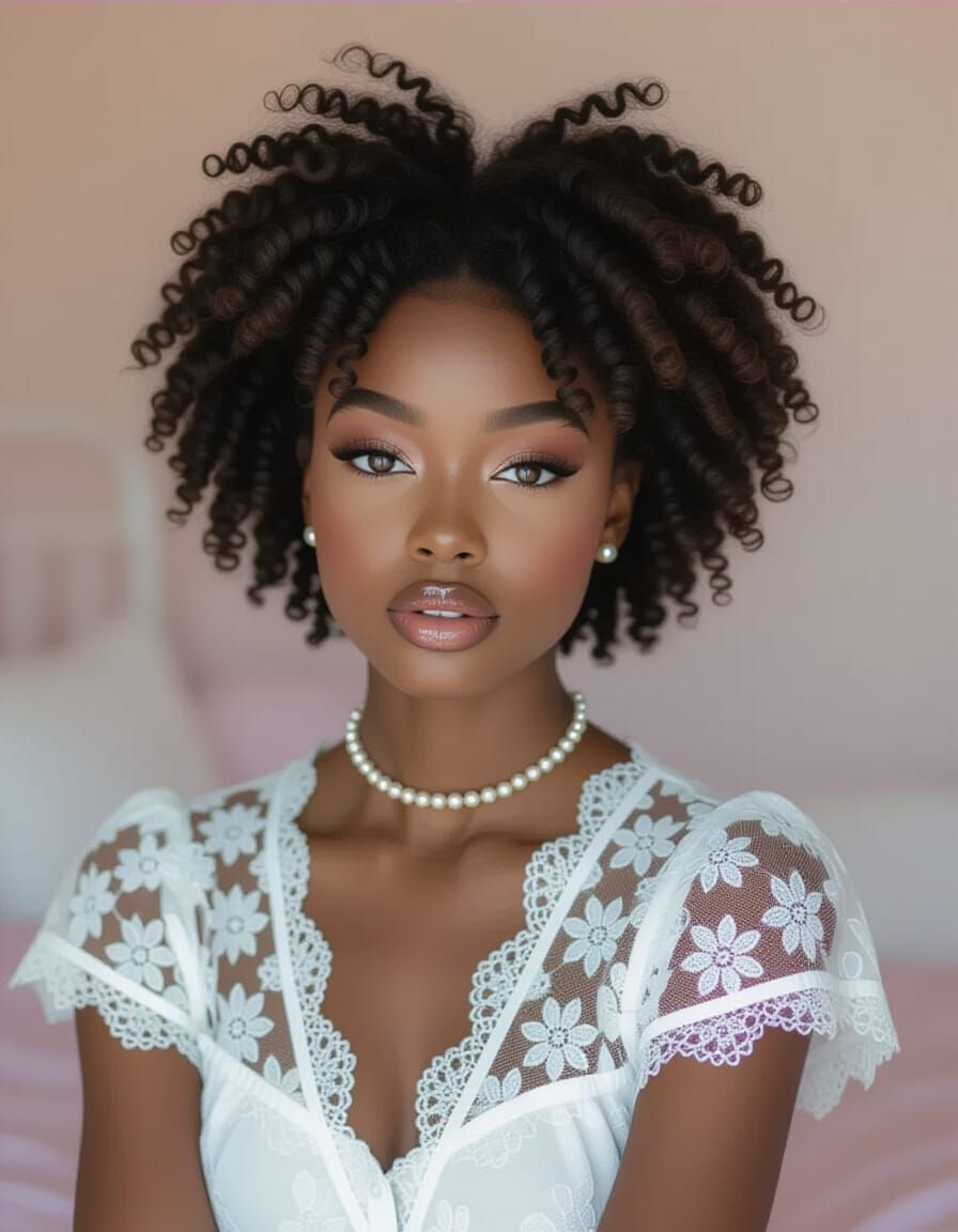 A striking, hyperrealistic image of a young Black woman with a cute afro and coquette makeup, wearing a lace blouse in her pink bedroom. Captured with exquisite detail and lifelike texture.