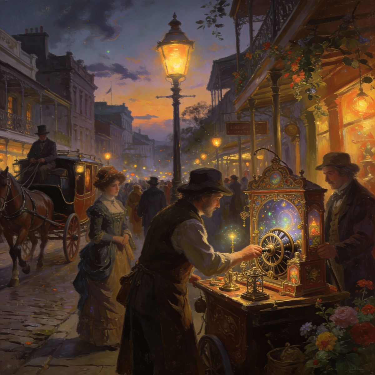 This image depicts a vibrant Victorian street at dusk, featuring a vendor with unique, mechanical storytelling devices. Detailed gaslight and carriages add to the atmospheric, illustrative style.