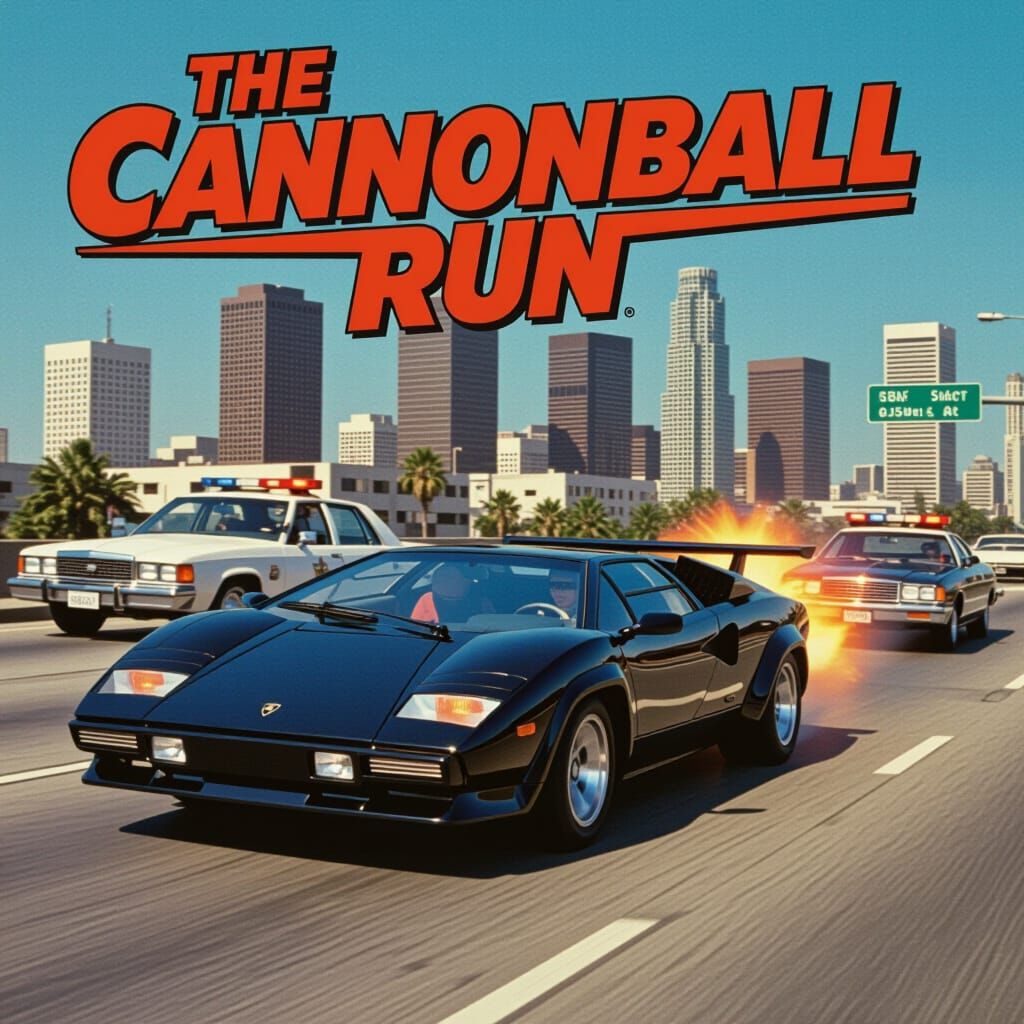 A retro poster of a black Lamborghini Countach LP 400 S speeding through downtown Los Angeles, pursued by a highway patrol car. The poster evokes an 80s aesthetic.