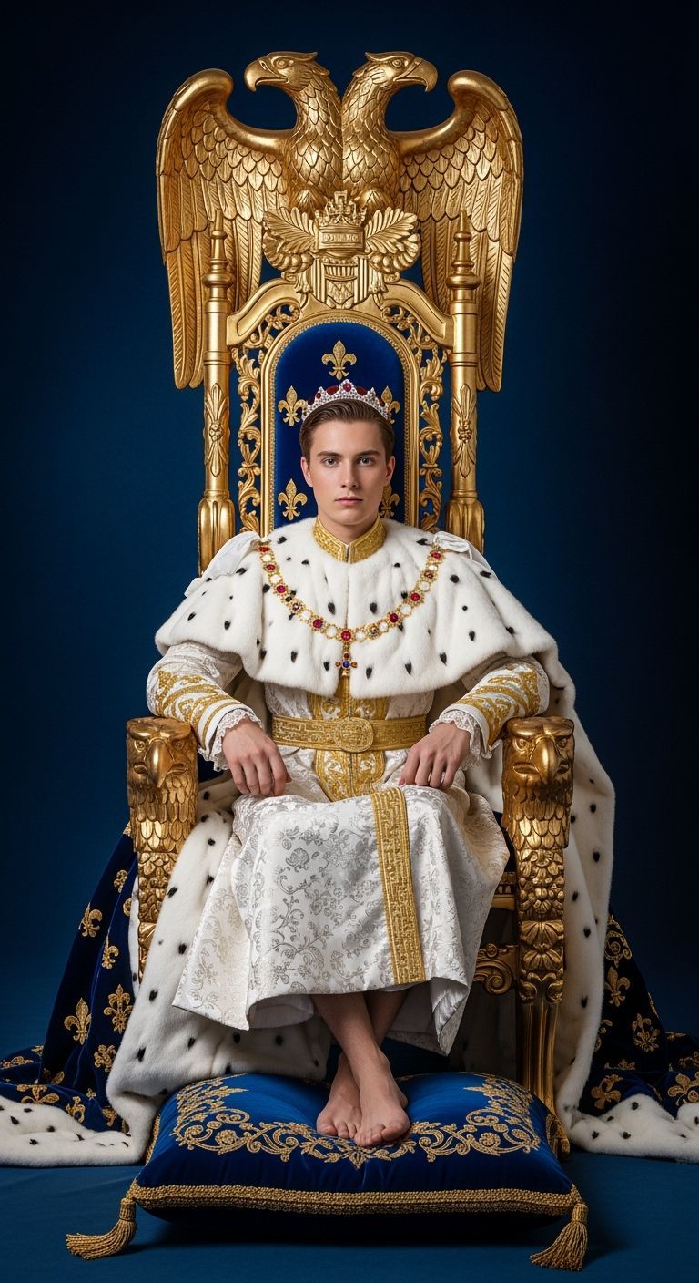 This image shows a young French Emperor regally posed on a golden eagle throne. He wears a white and gold robe, royal cloak, and sits barefoot with feet resting on a velvet pillow, in the style of royal portraiture photography.
