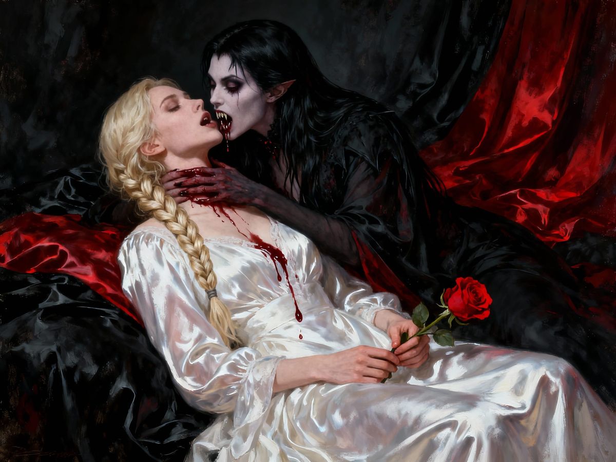 This dark fantasy oil painting depicts a vampire with black hair biting the neck of a blond woman in a white gown, with blood dripping. The background features black and red silk.