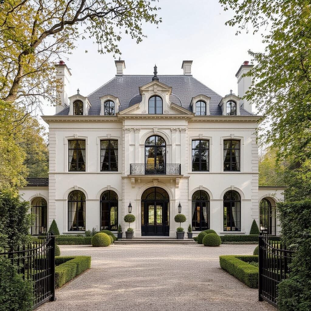 This image shows a grand Belgian castle-villa with white facades, arched windows, and a well-kept garden. The architecture evokes warm minimalism and elegant simplicity, blending modern and traditional design.
