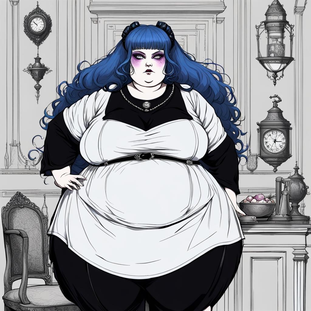 SSBBW Plasma Plagueyears the Enormously Fat very wide hips full belly very plump arms and thighs Morbid Gothic Enchantress a quite pale dhampyr blue-black fluffy hair bouffant with bangs fishnet sleeves chubby legs short boots in her Dark Arts Institute of Earth-5 t-shirt smiles triumphantly in the wainscoting walled servants' quarters at her vampiric parents Ravagar and Cyphryon, who are proud at her being so near earning her Mistress of the Black Arts degree
