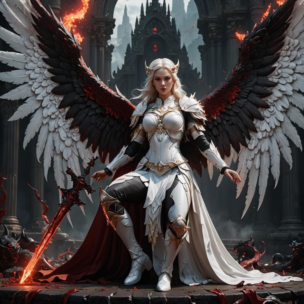 This image shows a stark contrast between good and evil. A pristine white angel stands tall before a kneeling demon rendered in shades of red and black, in fantasy concept art.