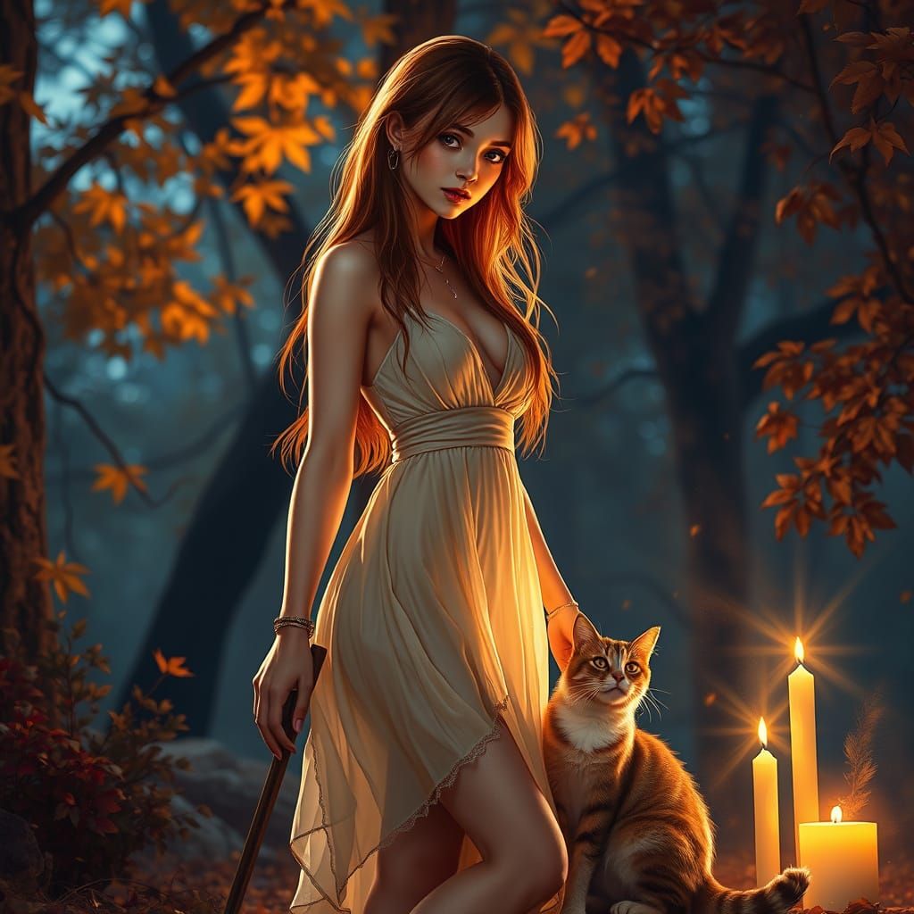 This hyperrealistic image shows a ginger woman in a flowing dress holding a staff, with her cat nearby. The scene is illuminated by dramatic, candlelit lighting on an autumn evening, rendered with rich textures.
